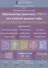 Το Τμήμα Μουσικών Σπουδών του Ε.Κ.Π.Α. με τη συμμετοχή της Περιφερειακής Διεύθυνσης Πρωτοβάθμιας και Δευτεροβάθμιας Εκπαίδευσης Αττικής διοργανώνει διαδικτυακή ημερίδα, με θέμα: «Αξιοποιώντας πρακτικές STEAM στη σχολική μουσική τάξη», η οποία θα πραγματοποιηθεί το Σάββατο 8 Νοεμβρίου 2025 και ώρες 9:30-13:30. Η ημερίδα επιδιώκει να προβάλει τις δυνατότητες και τις προοπτικές που προσφέρει η διαεπιστημονική προσέγγιση STEAM στη μουσική εκπαίδευση. Στόχος είναι να παρουσιαστεί το θεωρητικό πλαίσιο που υποστηρίζει τη σύνδεση της μουσικής με τις επιστήμες, την τεχνολογία, τη μηχανική, τις τέχνες και τα μαθηματικά, καθώς και να αναδειχθούν πρακτικά παραδείγματα εφαρμογών μέσα από την παρουσίαση καλών πρακτικών και διδακτικών σεναρίων STEAM στη μουσική σχολική τάξη. Ιδιαίτερη έμφαση δίνεται στην αξιοποίηση της τεχνητής νοημοσύνης για τη δημιουργία και τον σχεδιασμό μουσικοπαιδαγωγικών σεναρίων. Μέσα από εισηγήσεις, παρουσιάσεις και διάλογο, η ημερίδα επιδιώκει να εμπνεύσει και να δώσει ώθηση σε μια μετα-ψηφιακή, πολυτροπική και βιωματική μουσική παιδαγωγική, που ανταποκρίνεται στις επιθυμίες και τις ανάγκες των σύγχρονων μαθητών και μαθητριών. Η ημερίδα απευθύνεται σε εκπαιδευτικούς Μουσικής κάθε βαθμίδας Εκπαίδευσης και σε κάθε ενδιαφερόμενο/η.